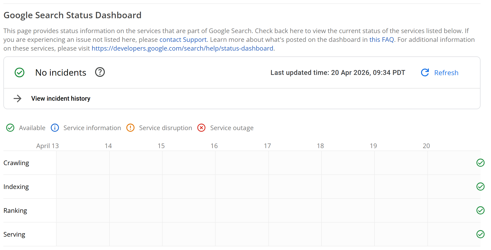 Search Status Dashboard exists for exactly this reason: it shows widespread issues across crawling, indexing, serving, and ranking, and it calls out significant ranking updates when Google actually wants site owners to know about them. If your traffic dipped this week and the dashboard is quiet, there is a decent chance the problem is a lot closer to home.